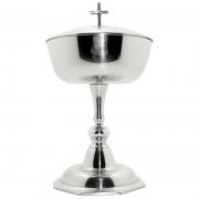 O Cibório vem do latim cibus, alimento. Objeto abençoado para distribuir a hóstia. Geralmente fabricado em metal, pode ou não possuir base/pé, e possui tampa.