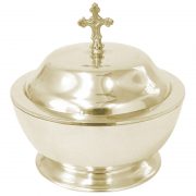 O Cibório vem do latim cibus, alimento. Objeto abençoado para distribuir a hóstia. Geralmente fabricado em metal, pode ou não possuir base/pé, e possui tampa.