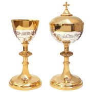 Conjunto Cálice e Cibório, no qual o cálice é um vaso sagrado que remete ao “Mandatum Novum” (nova aliança) do Senhor. Tem suas raízes na páscoa judaica.